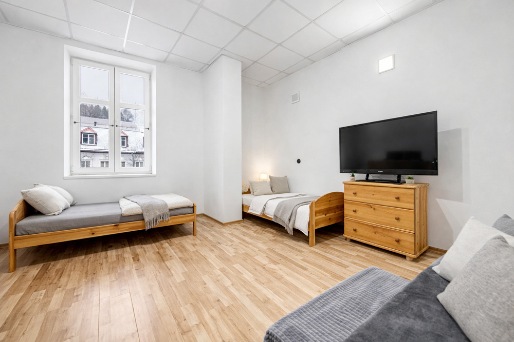 Fasáda orientovaná do námestia je zateplená, elektrické rozvody sú v medi a komfort zabezpečuje podlahové elektrické kúrenie. Technický stav vytvára spoľahlivý základ bez potreby okamžitých investícií.